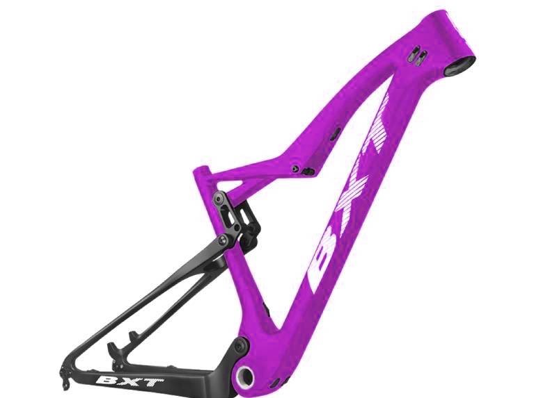 carbon full suspension mountain bike frame BXT-mtb-107 model, produced by EPS technology, carbon fiber T1000 materials with 100mm frame travel. Compatible with 142x12mm,135x9mm or BOOST 148x12mm rear wheel specifications. Can use tires up to 2.35 inches wide. Available in S",M",L",XL" sizes.